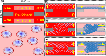 強磁性体/重金属積層構造において、電流からトルクを受けたスキルミオンは、電流に対しやや斜めの方向に駆動されます。その結果、図1(a)のような「横向きH型素子」の中を流れるスキルミオン流体は、二本の横棒部分(パイプAとB)では右方向に流れていこうとしますが、縦棒にあたるジャンクション部では右斜め上方向に流れていこうとします。これにより、下の横棒(パイプB)の左端(入力B)から注入されたスキルミオン流体は、上の横棒(パイプA)にスキルミオン流体が流れていない時はジャンクション部を通り、上の横棒(パイプA)を流れるようになる一方、上の横棒(パイプA)にスキルミオン流体が流れている場合は跳ね返されてそのまま下の横棒(パイプB)を流れ続けることになります。