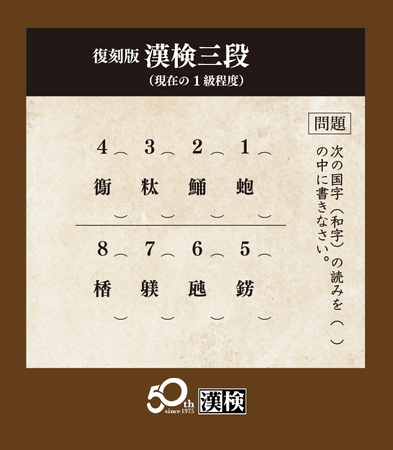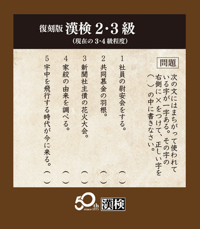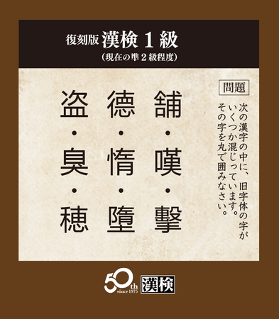 公益財団法人 日本漢字能力検定協会(代表理事 理事長:山崎信夫/所在地:京都市東山区/以下、当協会)は、日本漢字能力検定(以下、漢検)の開始50周年を記念し、段位のあった1992年以前の検定問題を再現した「復刻版漢検」を漢検ホームページにて公開しました。漢検が「五段〜15級」まであった時代の問題にどなたでも無料で挑戦いただけます。