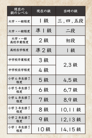 1992年の財団設立以降、現在の「1級〜10級」 (準1級、準2級を含む)の12段階に整えられましたが、それ以前は「五段〜15級」の20段階で、現在は存在しない“段位”制度が設けられていました。今回の「復刻版漢検」では、過去の資料に基づき当時の出題を再現しました。