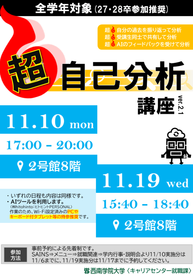 西南学院大学 就職課は、AIツールを活用した自己分析講座を実施いたします。つきまして、取材いただける場合は、前日15:00までに①会社名、②取材人数及び代表者氏名を、下記【本件についてのお問い合わせ先】までご連絡ください。