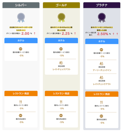 「GoTo Pass」は、全国180*を超える当社のホテルでご利用いただけるロイヤリティプログラムです。どなたでも入会可能で入会費・年会費は無料。当社はビジネスからリゾート・温泉までさまざまなスタイルの宿泊施設を展開しており、出張で利用した宿泊のポイントを休日にご家族とのリゾート旅行で使ったり、ライフスタイルに合わせてさまざまなシーンでポイントを貯めて使えるプログラムです。館内レストラン・売店が5% OFF*でご利用いただけたり、累積ポイントに応じたステージ(シルバー・ゴールド・プラチナの3段階)があり、ステージに応じた特典もご用意しています。また、ポイントが貯められるだけでなく、会員限定のメールマガジンで当社のイベントへのご招待などお得で貴重な情報も発信しています。*2025年11月1日時点