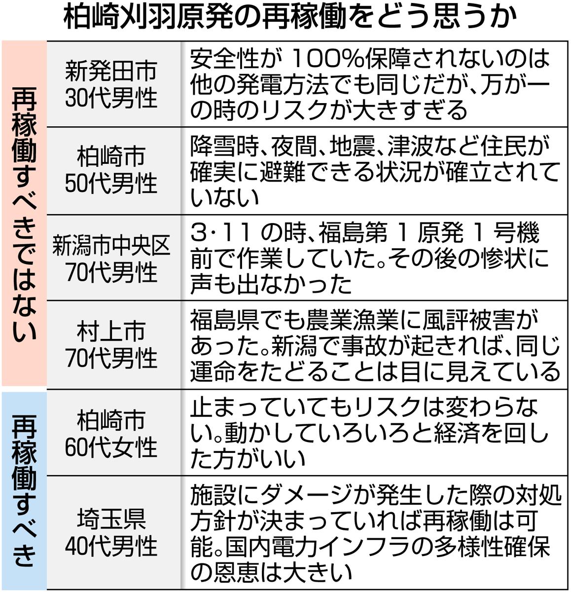 東日本大震災の発生時、福島第1原発で作業していたという新潟市中央区の70代男性は「その後の惨状に声も出なかった。再稼働には絶対反対」と回答。農家の村上市70代男性は「福島でも農漁業に風評被害があった。新潟でも事故が起きれば同じ運命をたどる」と危機感をにじませた。