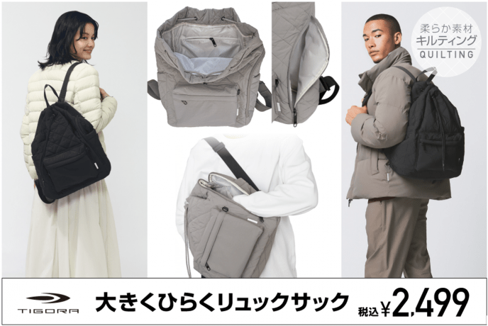 スポーツ用品販売の株式会社アルペン(本社:愛知県名古屋市、代表取締役社長:水野敦之)は、アルペンプライベートブランド「TIGORA(ティゴラ)」より、「大きくひらくリュックサック」シリーズから秋冬らしいキルティング素材を使用した新商品を全国のスポーツデポ、アルペン、オンラインストアにて順次発売いたします。「大きくひらくリュックサック」は、取り出し部が大きく開き快適に荷物の出し入れが可能な人気商品で、皆さまの秋冬のお出かけを快適にサポートします。