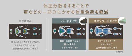 “極 - GOKUSHIN -”は頭部から足元にかけて特殊なスリット加工を施し、特に荷重の大きい肩や臀部にかかる体圧を効果的に分散します。この体圧分散の効用は仰向け寝だけでなく、横向き寝でも十分に発揮することが分かりました。下記の画像は睡眠時の体圧を色別で示したものです。「従来品」は局所的に体圧が掛かっていますが、“極 - GOKUSHIN –”のスタンダートやハードでは、身体とマットレスの接地面が広くなっていることがわかります。よって、各部位にかかる負担が軽減され、肩こりや腰痛などのリスクを低減できると考えます。