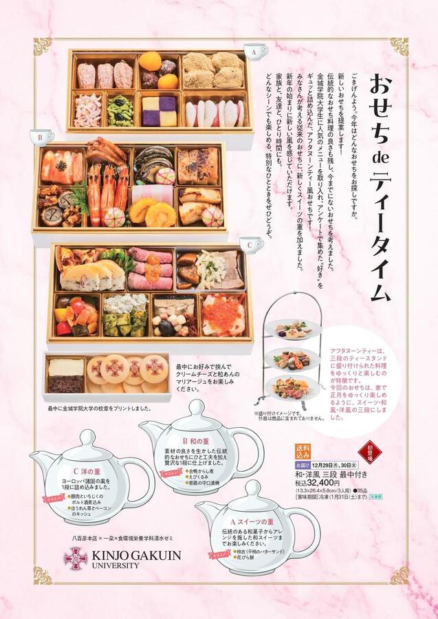 金城学院大学 食環境栄養学科は、松坂屋名古屋店および八百彦本店と連携し、「おせちdeティータイム」と題した新しいおせち料理企画を開発・発表しました。