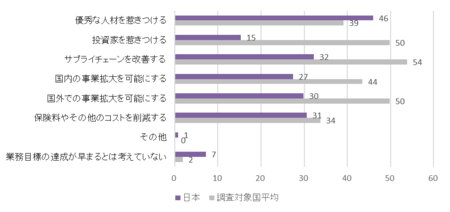 一方、日本においては、「優秀な人材を惹きつける」(46.0%)がもっとも高い割合を示しており、「サプライチェーンの改善」(32.3%)や「国外での事業拡大を可能にする」(29.8%)などは、調査対象国平均と比較して、控えめな割合にとどまっており、また、「投資家を惹きつける」ための要因としては非常に弱い(15.3%)といえる。