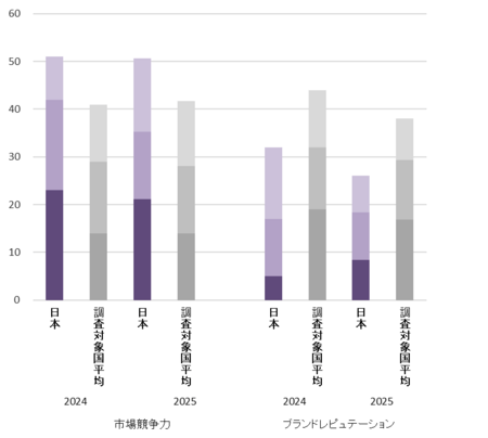 日本では、「市場競争力」を主要動機として挙げる割合が、2024年の52.0%から2025年は50.1%へとわずかに低下したものの、依然として過半を占め高水準である。一方、「ブランドレピュテーション」は、32.7%から26.1%へと低下した。(要因の第一位から第三位までを合算。)