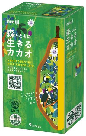 当社は 2006 年より、カカオ農家を支援する活動「メイジ・カカオ・サポート」を行っています。その支援先の一つに、 COP30 の開催地ベレンの近隣であるトメアスーがあります。トメアスーでは、「森をつくる農業」と呼ばれるアグロォレストリー農法を行っています。アグロフォレストリー農法とは、森林伐採後の荒廃した土地に、自然の生態系に倣った多種の農林産物を共生させながら栽培する農法です。自然へのダメージが少なく、持続的に長期間の土壌利用が可能になり、森林保護に繋がります。今回、この農法で作られたカカオ豆をカカオマス中に使用したチョコレート「アグロフォレストリーミルクチョコレート」も展示します。