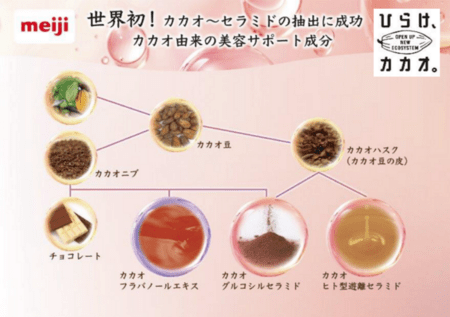 カカオの種皮より抽出した保湿成分で、 当社が世界で初めて素材化に成功しました。食品と化粧品両方への活用が期待でき、「カカオボーテ」ブランドとしてチョコレートやゼリーを販売するなど、今後も多様な展開を予定しています。