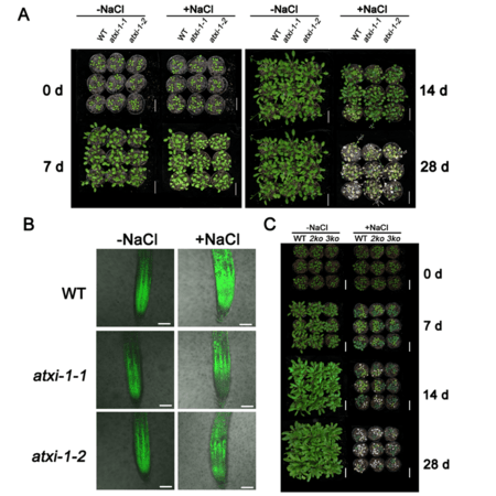 高く維持されることが観察されました。これにより、AtXI-1がNa⁺の取り込みや排出経路を制御し、細胞内のイオン恒常性を保つ役割を担っている可能性が示唆されます。一方で、atxi-kおよびatxi-2変異体の塩感受性は野生型と変わらなかったことから、AtXI-1のみが塩調節の特異的な機能を持つことが示されました。