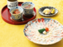職人が一枚一枚、丁寧に盛り付けた「とらふく刺身」と、関とら本店オリジナル吟醸酒、白子酒・ひれ酒・骨酒の三福酒を楽しめる贅沢なセット。