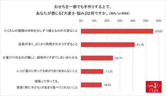 一方で、おせちを一部でも手作りする上で、感じる『大変さ・悩み』について聞いたところ、1位「たくさんの種類の材料を少しずつ揃えるのが大変なこと(55.6%)」、2位「品数が多く、とにかく時間がかかりすぎること(41.3%)」、3位「少量だけ作るのが難しく、結局作りすぎてしまい余らせる(24.7%)」という結果になりました。加えて、「頑張って作っても、家族(特に子ども)があまり食べてくれない」という悩みを抱える人も一定数いることから、「手間・時間」といった物理的負担に加え、「家族や子どもに喜んでもらえない」という精神的な“報われなさ”を感じていることが浮き彫りになりました。