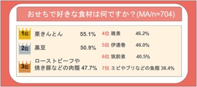 おせちで好きな具材を聞いたところ、「栗きんとん(55.1%)」、2位「黒豆(50.9%)」、3位「ローストビーフや焼き豚などの肉類(47.7%)」という結果になりました。