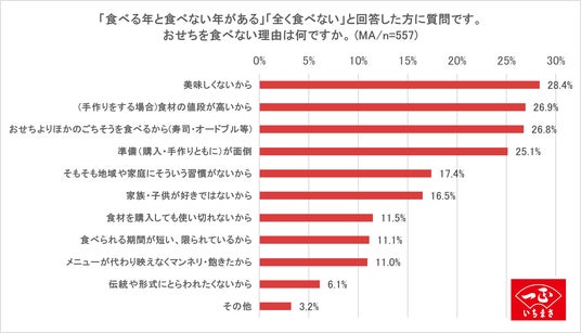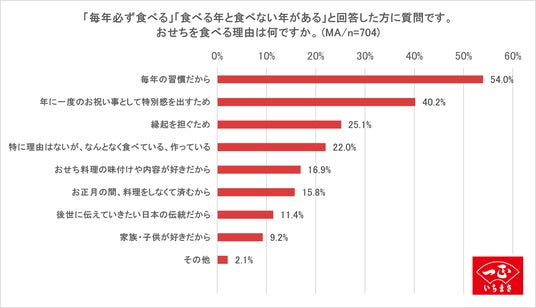 「食べる年と食べない年がある」「全く食べない」と回答した人へおせちを食べない理由を聞いたところ、1位「美味しくないから(28.4%)」、2位「(手作りする場合)食材の値段が高いから(26.9%)」、3位「おせちよりほかのごちそうを食べるから(26.8%)」という結果に。一方で、「毎年必ず食べる」「食べる年と食べない年がある」と回答した人へおせちを食べる理由を聞いたところ、1位「毎年の習慣だから(54.0%)」、2位「年に一度のお祝い事として特別感を出すため(40.2%)」、3位「縁起を担ぐため(25.1%)」であることが分かりました。
