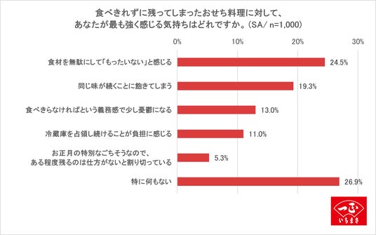 食べきれずに残ってしまったおせちに対して、最も強く感じる気持ちについて聞いたところ、1位「食材を無駄にして“もったいない”と感じる(24.5%)」、2位「同じ味が続くことに飽きてしまう(19.3%)」、3位「食べきらなければという義務感で少し憂鬱になる(13.0%)」という結果になりました。