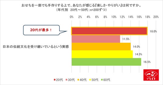 また、「日本の伝統文化を受け継いでいるという実感」という項目に対しては、全体の中で20代が最も高い割合(18.0%)を示したことから、おせち文化の継承に対する意識は、むしろ若い世代で強い可能性が判明しました。
