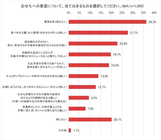 おせちへの要望について聞いたところ、1位「費用を安く抑えたい(36.3%)」、2位「食べきれる量(少人数用)のおせちがもっと欲しい(27.7%)」、3位「添加物などが少ない、安心なものや食材の産地がわかるものが良い(22.8%)」という結果になりました。さらに、「伝統的な品目にこだわらず、洋風や中華などのメニューももっと増やしてほしい(19.7%)」「お正月後の日常でも食べられて、食材を使いきれるメニューが欲しい(18.9%)」などの声が次いで多いことも分かり、おせちのマンネリを脱して、家族の好みに合わせられるメニューの柔軟性を求めていることが分かりました。