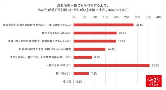 おせちを一部でも手作りする上で、感じる『楽しさ・やりがい』について聞いたところ、1位「家族や自分の好きなメニュー・量に調整できること(28.1%)」、2位「費用を安く抑えられること(20.2%)」、3位「手作りならではの達成感や、家族に喜んでもらえること(19.8%)」という結果になりました。