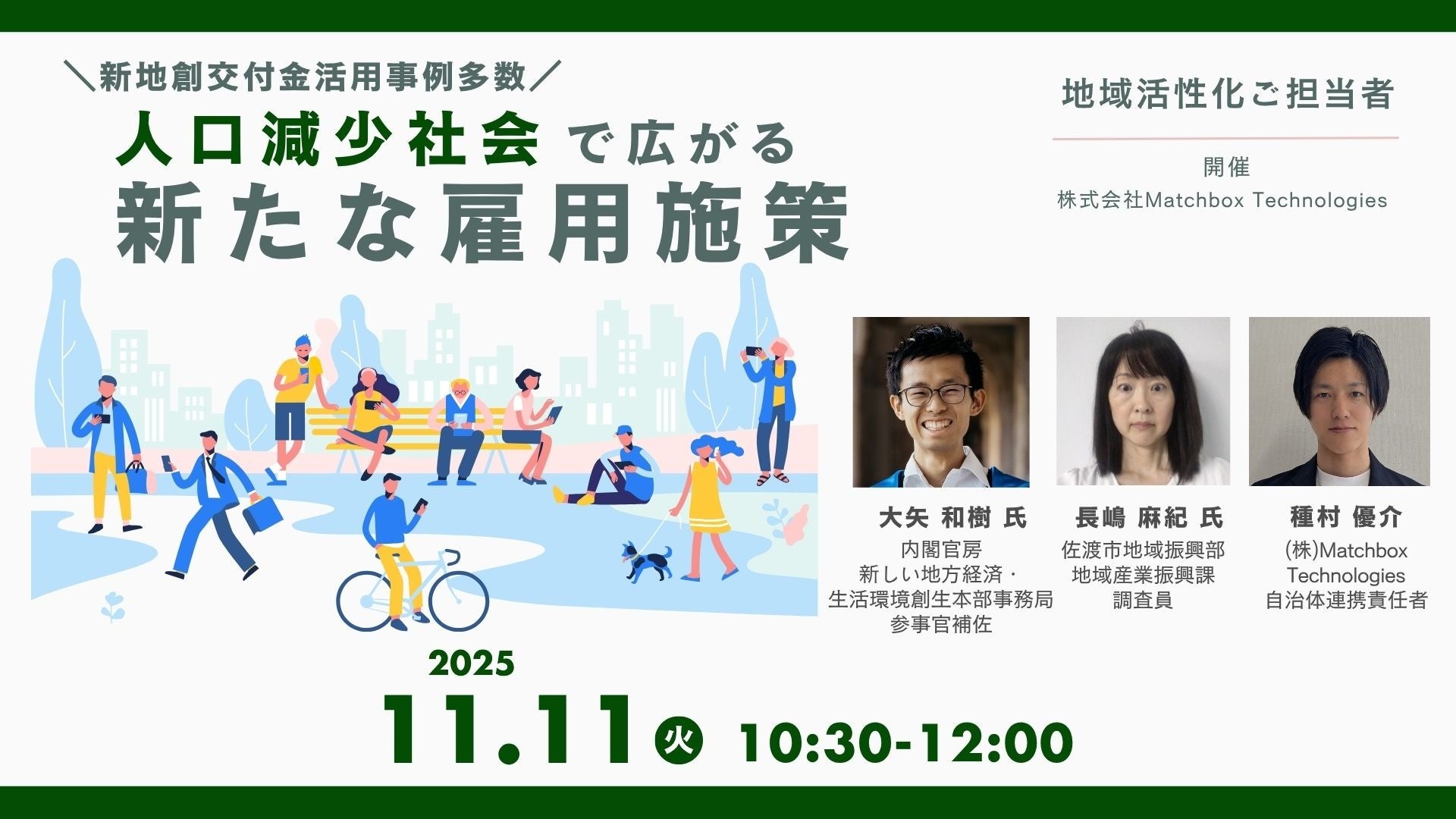 当社は11月11日(火)10:30~12:00に、全国の地方自治体職員および地方活性化に関わる担当者に向けた新たな雇用政策に関するオンラインセミナーを開催いたします。