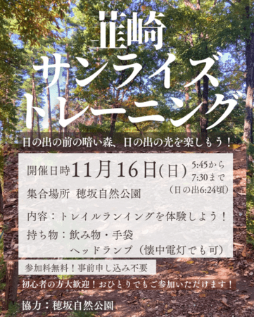 韮崎市(山梨県)は、穂坂自然公園を舞台にした早朝トレイルランニング体験イベント「韮崎サンライズトレーニング」を2025年11月16日(日)に開催いたします。