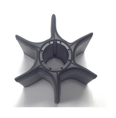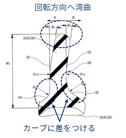 船外機の冷却水をエンジンに循環させるポンプ内に設置され、 冷却水の流れをスムーズにする部品「インペラー」の形状設計に関する発明です。インペラーの羽根を回転方向に湾曲させた形状にするとともに、羽根の根元部分のカーブを回転方向側と逆側とで非対称に設計しました。これにより、羽根が滑らかに動きやすくなり、特に破損しやすい根元部分へひずみが集中することを抑制しています。本形状を用いることで、インペラーの耐久性が向上し、ポンプ性能を安定的に維持することが可能になりました。