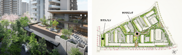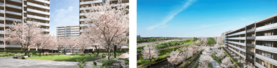 本物件は、長期優良住宅認定を取得予定で、耐震性・省エネ性・維持管理の容易さを備えた“安心して長く住み続けられる住まい”を目指しています。さらに、CASBEE(建築環境総合性能評価システム)Aランクを取得し、住棟でのZEH-M Oriented(ゼッチ・マンション・オリエンテッド)認証も取得予定です。環境性能に優れた住宅として、持続可能なまちづくりに貢献し、将来的な価値にも寄与する取り組みを行います。根川さくら通りに接する住棟からは春の桜並木を間近に楽しむことができ、季節の彩りを日常に取り込めます。敷地内には、春を象徴する「サクラノソノ」「サクラリング」(次項完成予想CG参照)をはじめ、イチョウゲート(秋)やフォレストプロムナード(夏)などを配置し、四季を通じて自然を感じられる街づくりを推進します。敷地の約1haを公園や遊歩道として整備し、地域に開かれた潤いある環境を形成します。