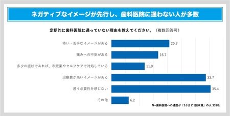 歯科医院への通院頻度を問う質問では、29.4%が「3か月に1回以上」歯科医院に通っていると回答。7割以上の人がそれ未満と回答し、プロケア(歯科専門家による口腔ケア)を日常的に実施している人は3割に満たないという結果となりました。また、定期的に歯科医院に通わない理由としては「通う必要性を感じない」「治療費が高いイメージがある」「怖い・苦手なイメージがある」という回答が上位にあがり、歯科へのネガティブなイメージが浮き彫りとなりました。さらに、毎食後の歯磨きについては、47.6%が「毎食後、必ず歯磨きをしている」と回答。反対に「しないこともある」と回答した人は半数を超えており、セルフケア(ご自身による口腔ケア)を欠かさず行っている人が5割を切る結果となりました。プロケアとセルフケアの両方で口腔ケアを実践している人(投歯家)はわずか15%に留まっており、正しい口腔ケアが行われていない実態が明らかになっています。