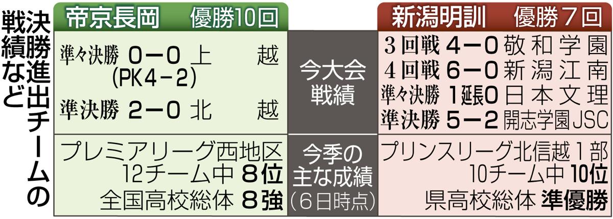 サッカーの全国高校選手権県大会の決勝が9日午後0時20分から、新潟市中央区のデンカビッグスワンで行われる。互いに堅い守りから勝機をうかがう帝京長岡と新潟明訓がぶつかる。