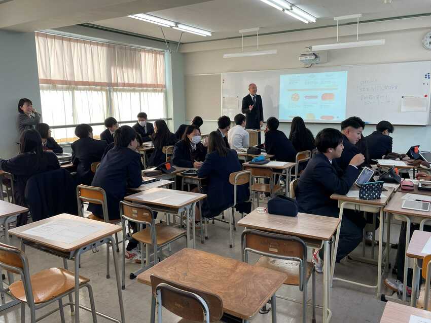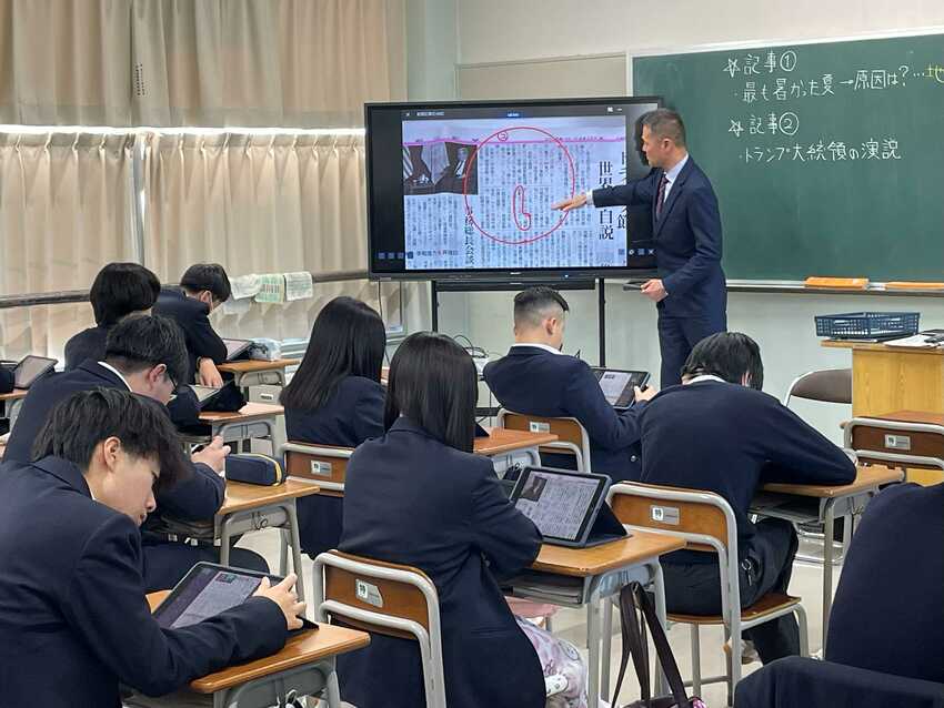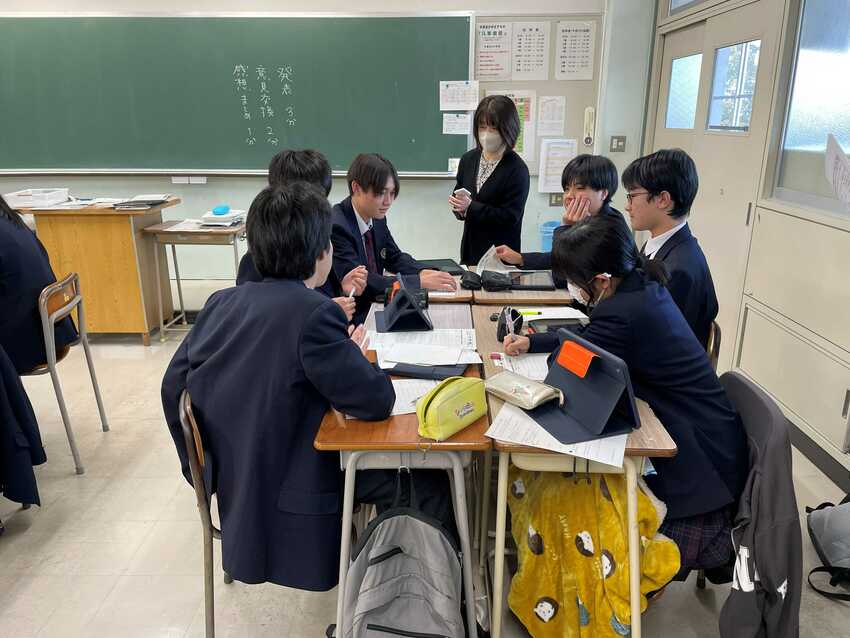 小池智紀教諭と二瓶紗和子教諭による第1学年「新聞記事を自分の将来に生かす視点」の授業では、NIEコーナーの新聞から興味のある記事や自分の将来に生かせる記事を見付けて各自のテーマに沿ってまとめたものを、タブレット端末を用いてグループ内で発表する学習が展開されました。生徒が自分の考えを分かりやすく伝えたり、他の人の発表に対して建設的な意見を述べたりする中で、発表力を確実に高めていく姿が印象的でした。最後まで和やかな雰囲気で授業が進みました。