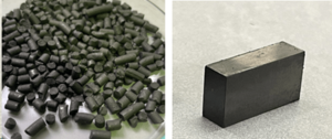 図1.窒化鉄系磁石の例。 左:窒化鉄系磁石の射出成形ペレット、右:圧粉成形磁石