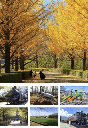 公園内には、巨大カブトムシや蒸気機関車、電気機関車などのオブジェもあり、フォトスポットとしても人気です。