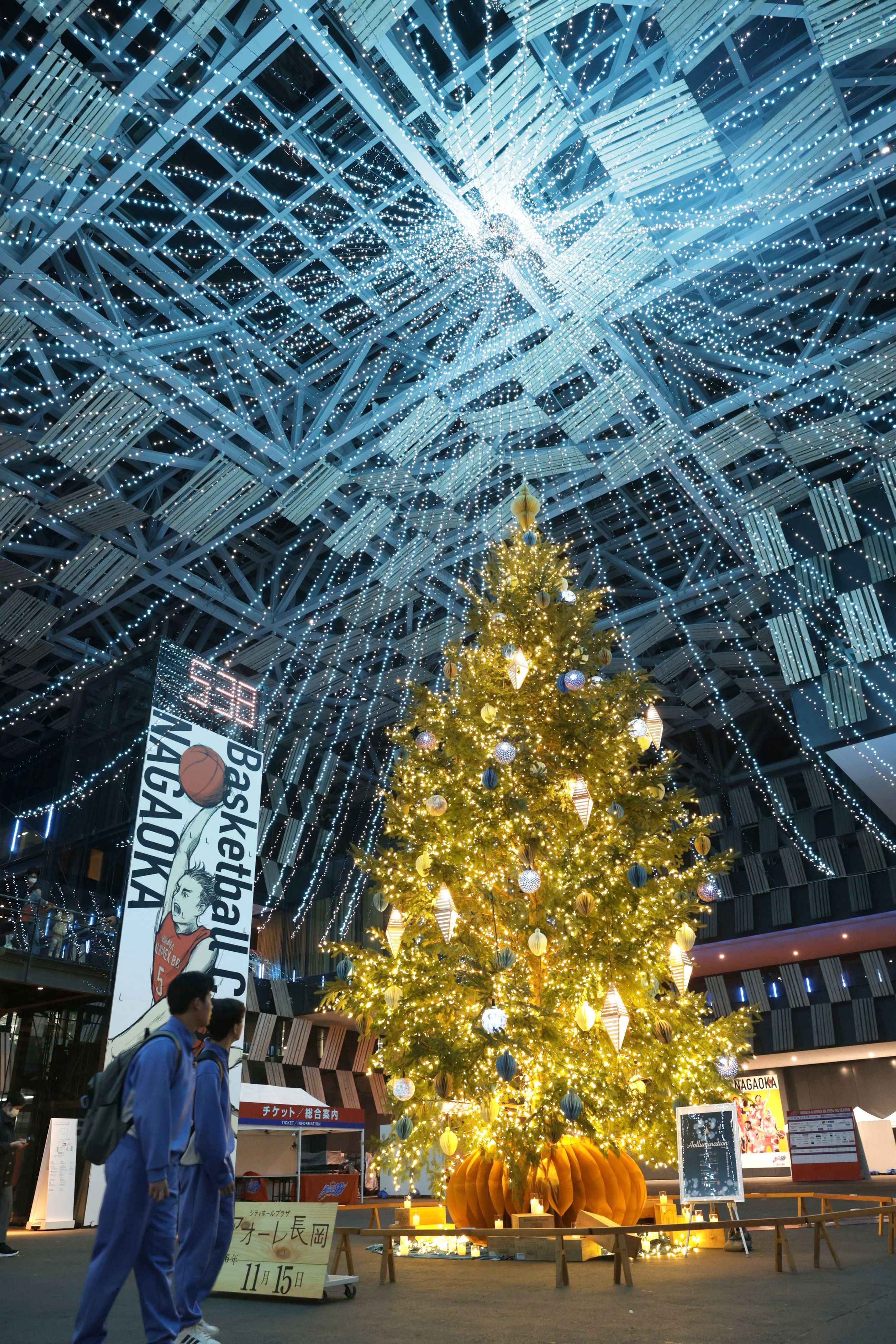 11月14日~2026年2月23日、アオーレ長岡。光と音楽によるイルミネーション。点灯は午後4時~午後9時(音楽演出は午後8時まで)。12月25日まではクリスマスツリーも。