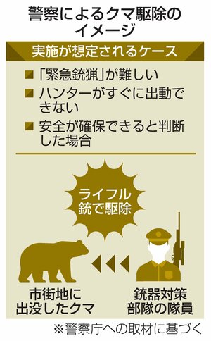 警察官がライフル銃を使用してクマを駆除することが可能になる。人里への出没が増え、対応に当たる人員の不足に悩む地元自治体は「負担が減る」と歓迎する。一方、射撃には高い技術を要し、経験が乏しい警察官による駆除には危険が伴う上、被害収束に直結するかどうか懐疑的な意見も。専門家は技能習熟のために中長期的な計画を立て、十分な訓練を経て臨む必要があると指摘する。