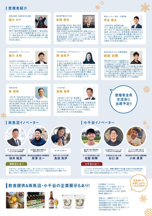 新潟県内でも降雪量の多いエリアに位置する小千谷市と南魚沼市では、ローカルスタートアップが盛り上がっています。本イベントでは、そのイノベーションシーンの現在地をご紹介し、首都圏の皆さまとこれからの展望を共有することで、未来に向けた新たな化学反応を生み出します。