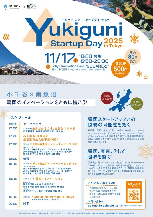 2025年11月17日(月)、小千谷市と南魚沼市で「Yukiguni Startup Day 2025」を共催します。