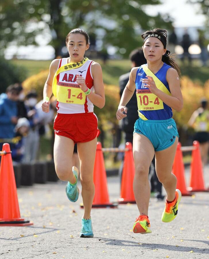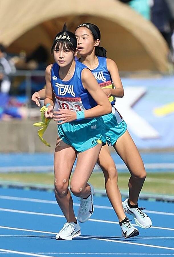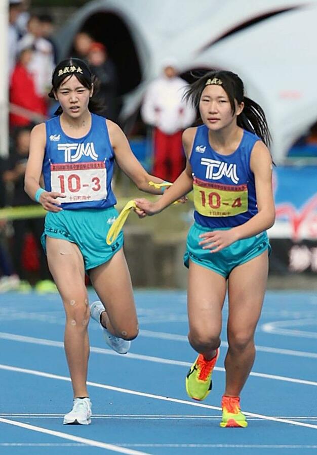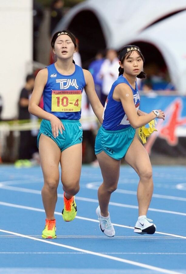 [県中学校駅伝・記録]女子の十日町南は残り約600メートルで逆転し、2連覇を決めた。アンカー蔵品和花はゴール直後に倒れ込み、両拳を天に突き上げた。最後は底力でスパートし、「みんなの気持ちがこもったたすき。1番でゴールできてよかった」と破顔した。