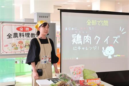 教室の合間には食材への理解を深める一環として、全農チキンフーズ(株)から参加者の皆さんに向けて「鶏肉クイズ」を実施しました。「新鮮な鶏肉の特徴は?」などの問題に、楽しそうに挑戦し学びを深めていました。また、新商品「農協サラダチキン」についても紹介し、参加者の皆さんにお渡ししました。