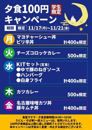 金沢工業大学では学生を対象とした「100円夕食」を11月17日(月)から11月21日(金)まで、扇が丘キャンパス21号館1階 ラテラで行います。