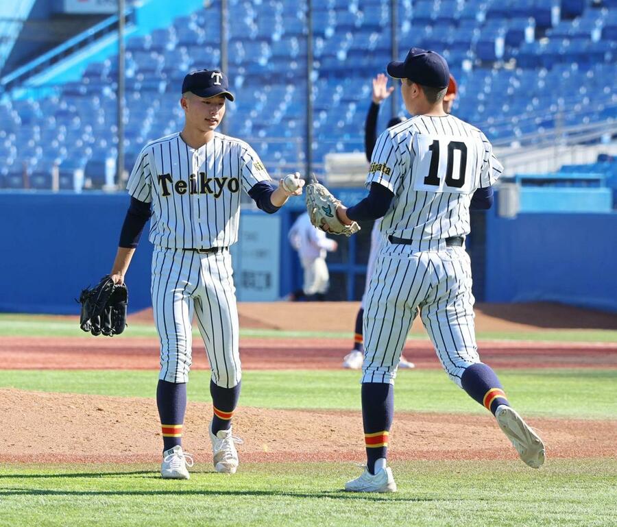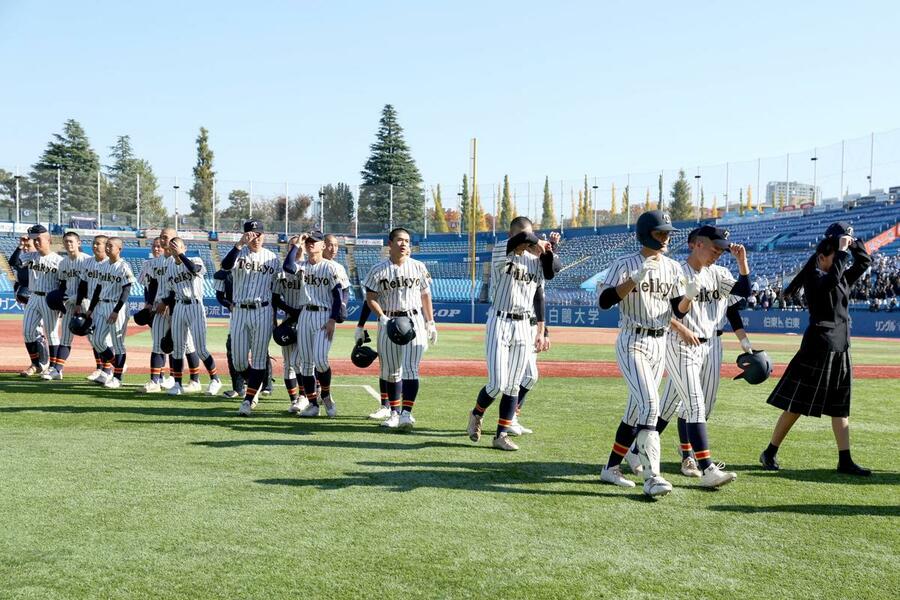 英明-帝京長岡 初戦で敗れスタンドに向かう帝京長岡の選手たち=明治神宮野球場