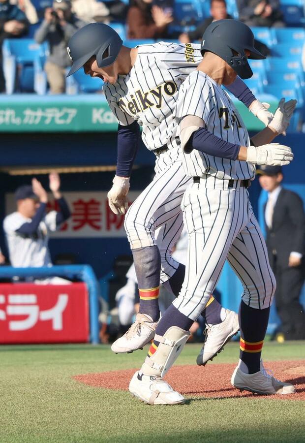 英明-帝京長岡 帝京長岡3回1死三塁、敵失間に同点の生還を果たした三走富田惇紀がベンチに迎えられる=明治神宮野球場
