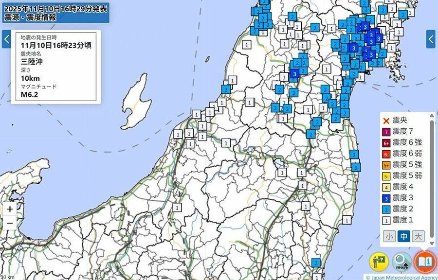 10日午後4時23分ごろ、地震があった。気象庁によると、震源地は三陸沖で、地震の規模を表すマグニチュードは6・2と推定される。青森県や岩手県、秋田県などで震度3を観測した。