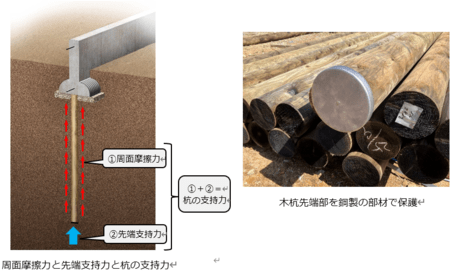 軟弱地盤における住宅等での地盤補強⼯法は大きく分けると、鋼製やコンクリート製等の杭状の補強材を打ち込む工法と、地盤そのものをセメントなどで固める工法があります。「環境パイル工法」は木製の杭状の補強材を打ち込む工法で、杭と杭周囲の土の摩擦によって生じる周面摩擦力と安定した地盤まで先端を到達して支持する先端支持力によって、建物を支持する工法です。「環境パイル工法」は特性上、先端支持力の確保が難しく、杭長が短くなる地盤条件下では十分な周面摩擦力が得られず、支持力が小さくなり、採用しづらいという課題がありました。今回開発した「SH-KPパイル工法」では、地盤調査の方法や杭先端の形状を工夫することで、「環境パイル⼯法」と比べて高い先端支持力が確保でき、適用可能な地盤の範囲拡大に成功しました。