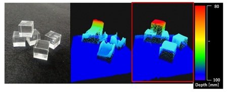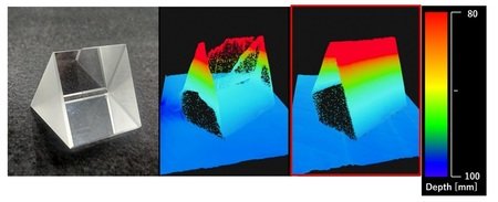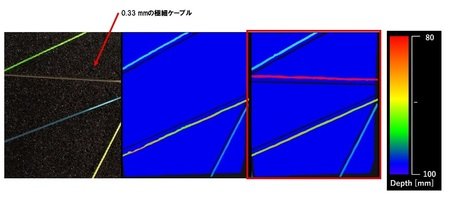 本カメラは、3つのレンズと独自AIの組み合わせにより、“左-中央”、“中央-右”、“左-右”の3組の視差情報を10cmの近距離から取得します(図1参照)。複数の視差データを組み合わせることで、誤認識を減らし、死角を少なくすることが可能となり、測定の信頼性が大きく向上します。これにより細くて形が不規則な線状の物体(例:ハーネス)や、直径わずか0.3mmの極細ケーブルも正確に距離測定ができます(図2参照)。さらに、2眼では測定困難だった対象物、具体的には繰り返し模様を持つ対象物や部分的に反射する金属、半透明のプラスチックなど、物体表面にあまり特長がない対象物でも正確に距離を測定できます(図3、4参照)。