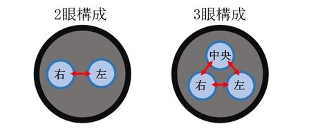 図1:2眼AI測距カメラ(左)と3眼AI測距カメラ(右)の概略構成図