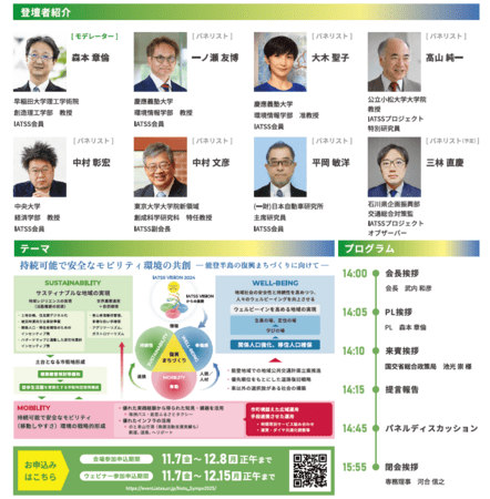 昨年の学会50周年記念式典で発信した「IATSSビジョン2024」に基づき、幸福感に満ち、持続可能な地域を実現すべく、安全なモビリティ環境をどのように推進するべきか、様々な戦略・施策の提言を行います。またその後、プロジェクトメンバーによるパネルディスカッションにより、その提言内容をより深く掘り下げた議論を行い、提言にこめた様々な思いもお伝えします。