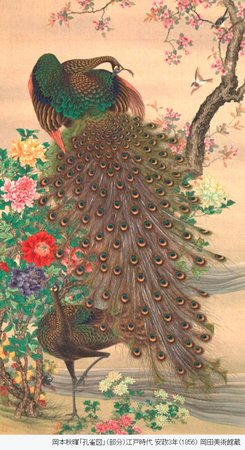 自由に空を飛べる鳥たちは、人間が到達できない神々の世界からの使者とされ、神聖なものと考えられてきました。太平の世を知らせる「鳥の王」鳳凰をはじめ、長寿の鳥とされる鶴や、鶺鴒などの可愛らしい小鳥が描かれ、おめでたい松や牡丹といった植物も、その場を華やかに荘厳します。鳥が舞い飛び、花が咲く理想郷をご堪能ください。