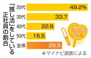 20代正社員の半数が、アイドルやキャラクターなどの「推し活」をしている-。就職情報会社のマイナビが、こんな調査結果をまとめた。全体でも3割に上り、幅広い世代に浸透。私生活の充実だけではなく、仕事への意欲につながっている様子もうかがえた。