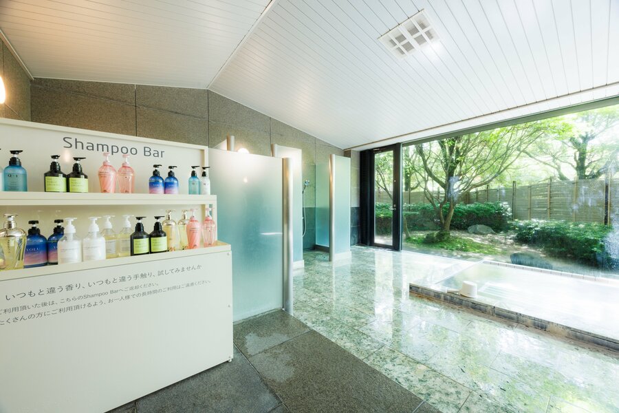 左から)きれいになった女性パウダーコーナー、シャンプーバーを新設した女性浴室、8月に新設した LED ビジョン