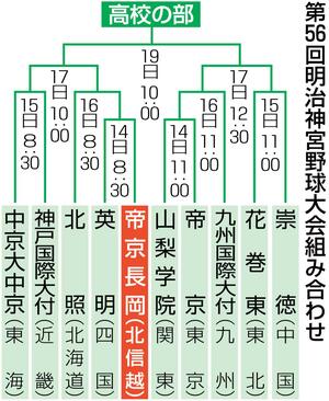 第56回明治神宮野球大会が14日から、東京・神宮球場で行われる。高校の部には、各地区の秋季大会を制した計10校が集い、本県の帝京長岡は北信越代表として出場する。唯一の初出場校である帝京長岡は開幕戦に登場。14日午前8時半から、四国代表の英明(香川)と対戦する。