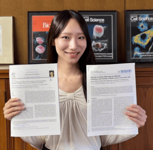 森下さんは2年次より細胞移動に関わる基礎医学研究を始め、浸潤性の高いがん細胞で、先端に多層になった膜ヒダを持つ特殊な葉状突起(ruffle-edge lamellipodia、RELと略)の存在を発見し、2024年に論文として発表しました。今回、この研究をさらに発展させ、このREL形成と運動に関わる不可欠な因子としてミオシン1E(Myo1E)を同定し、国際学術専門誌『Microscopy』に論文として報告しました。